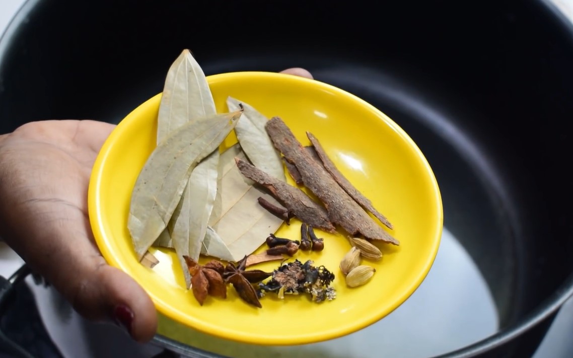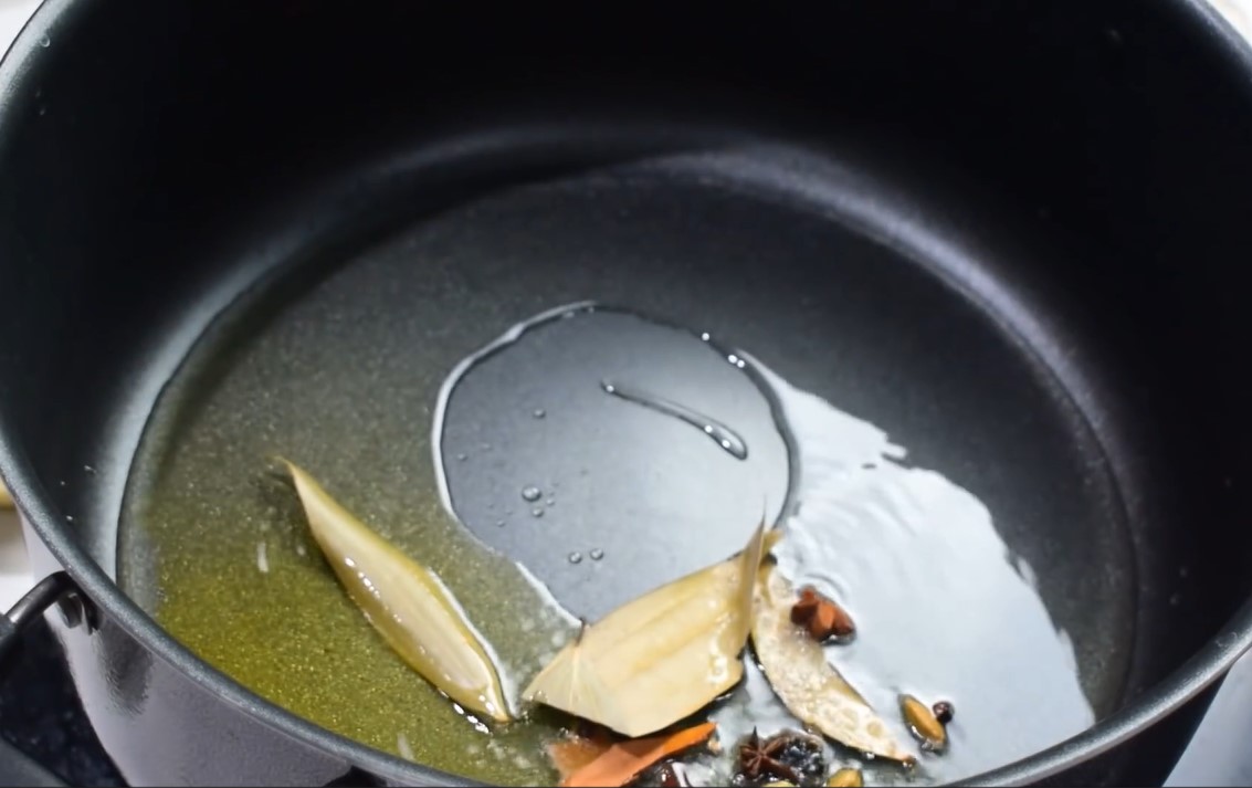 Once heated, add cloves, cardamom, bay leaves, star anise, and cinnamon sticks.