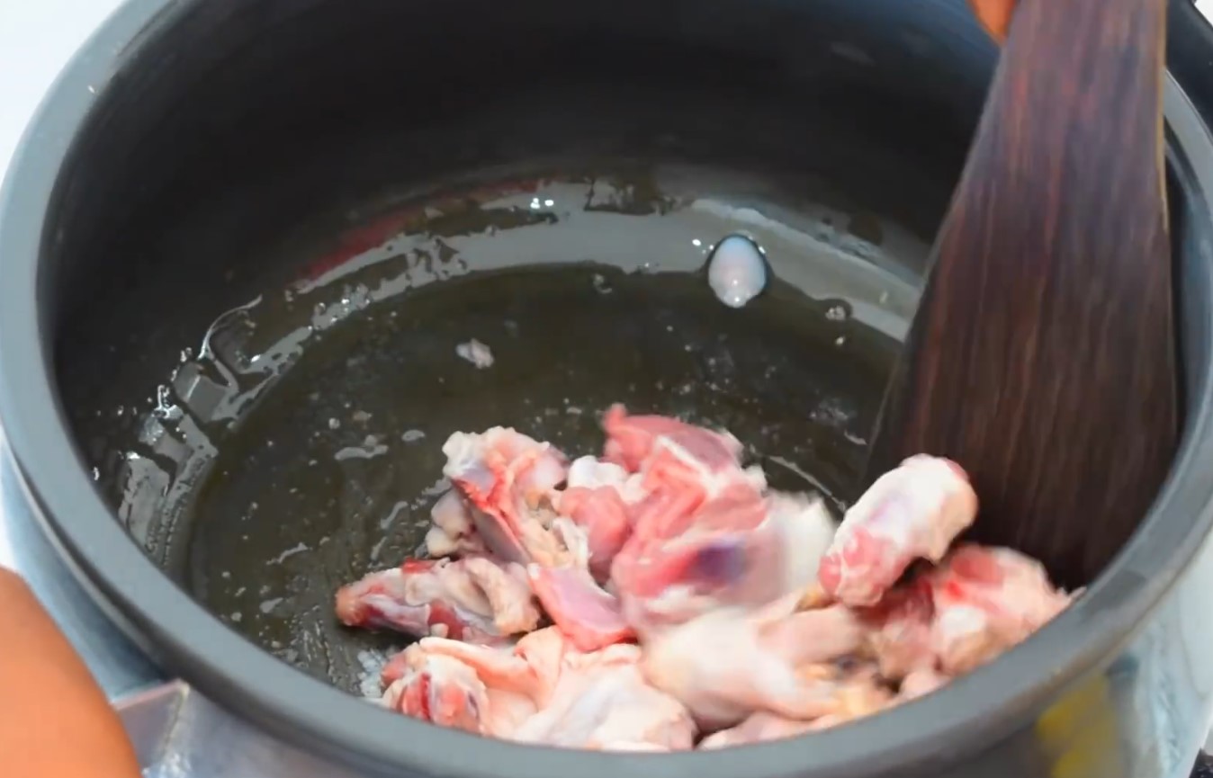 - Add the mutton pieces and sauté them until the color changes slightly. This step helps seal the flavor of the meat.