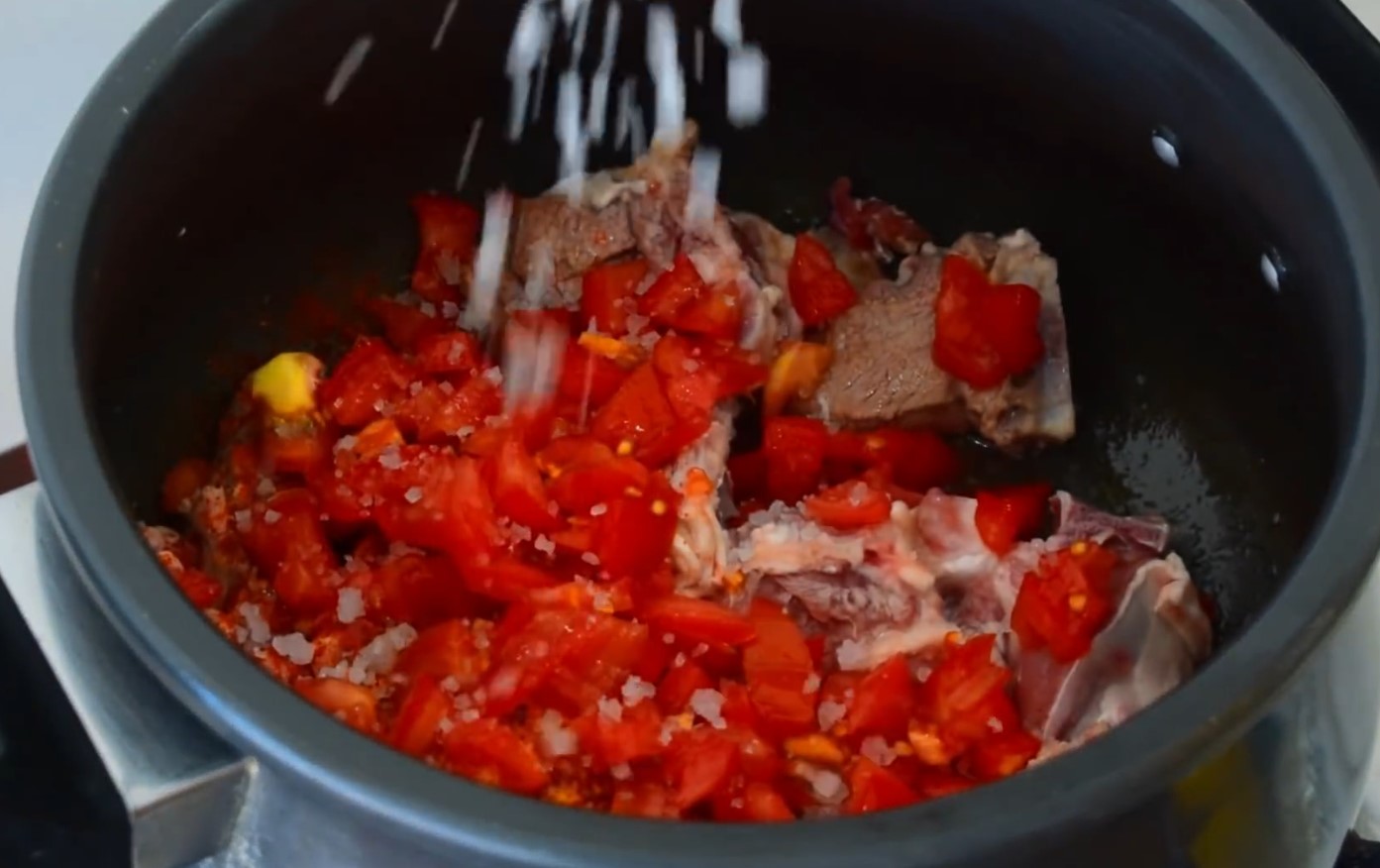 - Add red chili powder, turmeric powder, chopped tomatoes, salt, and water. Mix everything well so the spices coat the meat evenly.